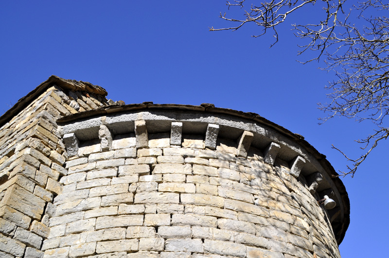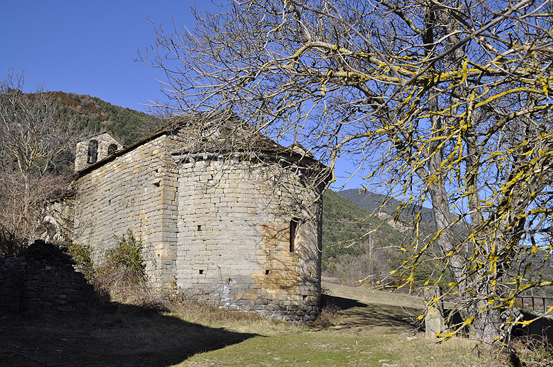 El ábside, realizado en buena cantería como la mayoría de los muros, apenas presenta elementos ornamentales; de los 16 canecillos de la cornisa solo 2 portan decoración: uno de ellos con un motivo zoomorfo, y otro con decoración de rollos de origen hispanomusulmán y de los que tenemos ejemplos en la Catedral de Jaca. Centrada en el ábside, y casi como único elemento decorativo, una ventana de arco de medio punto dovelado.